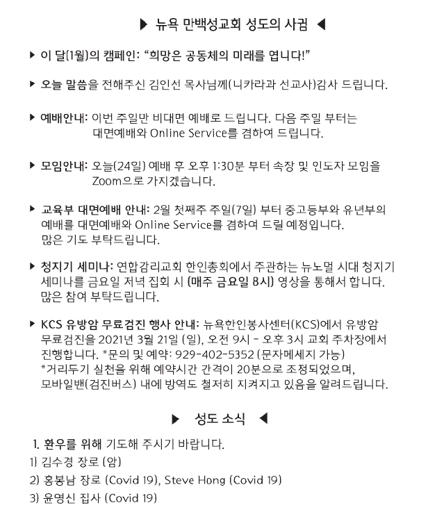 [교회소식] 2021년 1월 24일 뉴욕만백성교회 성도의 사귐