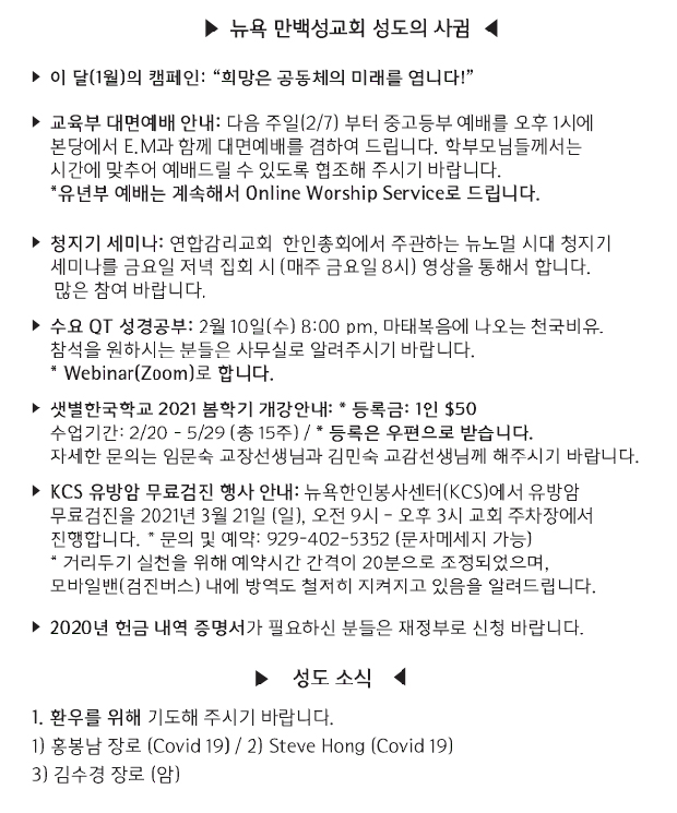 [교회소식] 2021년 1월 31일 뉴욕만백성교회 성도의 사귐