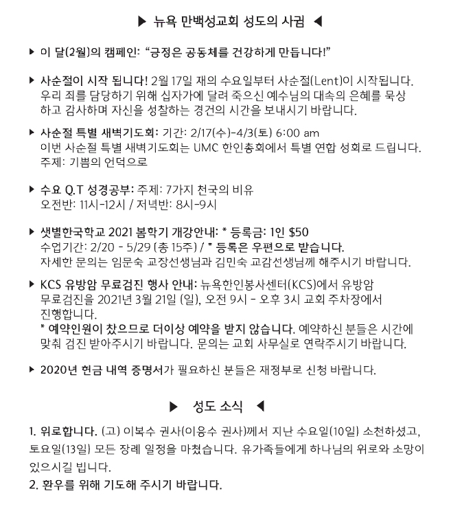 [교회소식] 2021년 2월 14일 뉴욕만백성교회 성도의 사귐