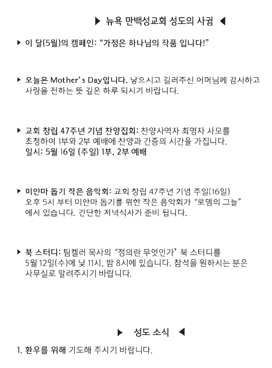[교회소식] 2021년 5월 9일 뉴욕만백성교회 성도의 사귐
