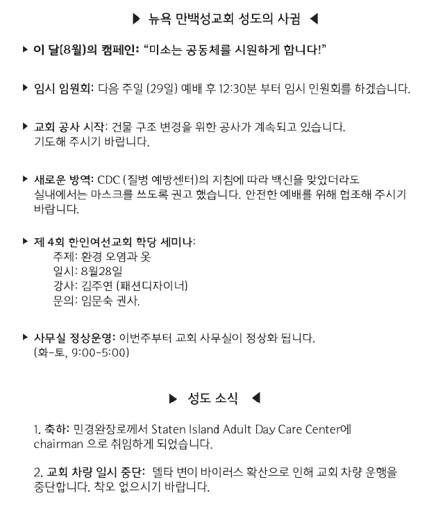 [교회소식] 2021년 8월 22일 뉴욕만백성교회 성도의 사귐