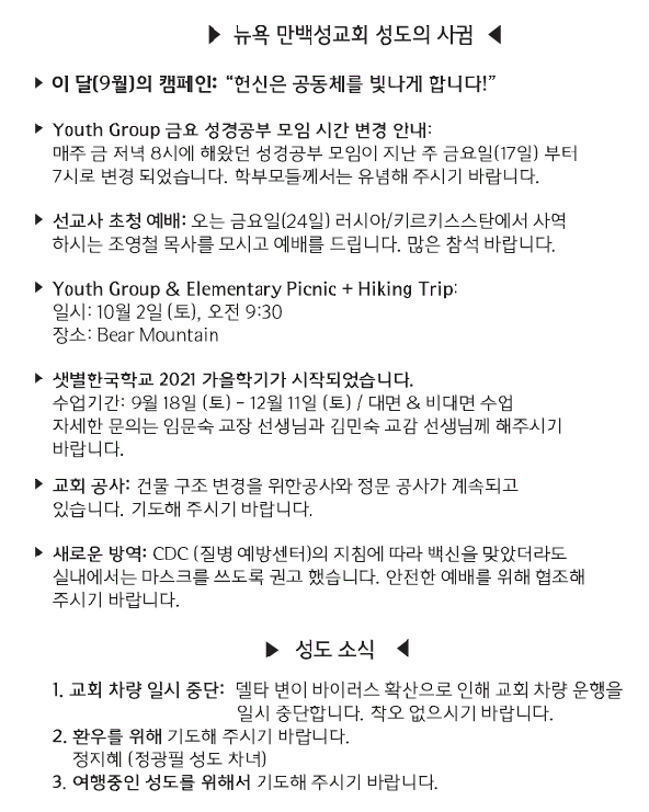 [교회소식] 2021년 9월 19일 뉴욕 만백성교회 성도의 사귐