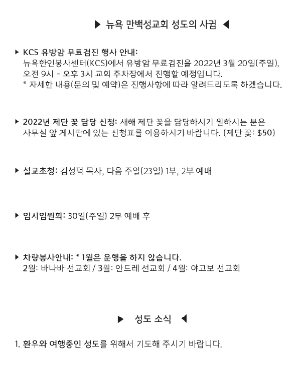 [교회소식] 2022년 1월 16일 뉴욕 만백성교회 성도의 사귐