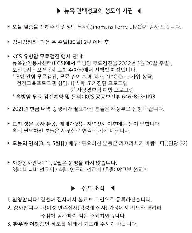 [교회소식] 2022년 1월 23일 뉴욕 만백성교회 성도의 사귐