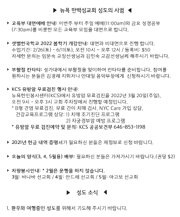 [교회소식] 2022년 2월 6일 뉴욕 만백성교회 성도의 사귐