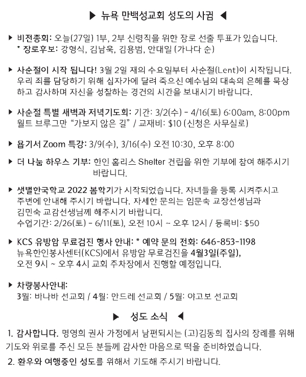 [교회소식] 2022년 2월 27일 뉴욕 만백성교회 성도의 사귐