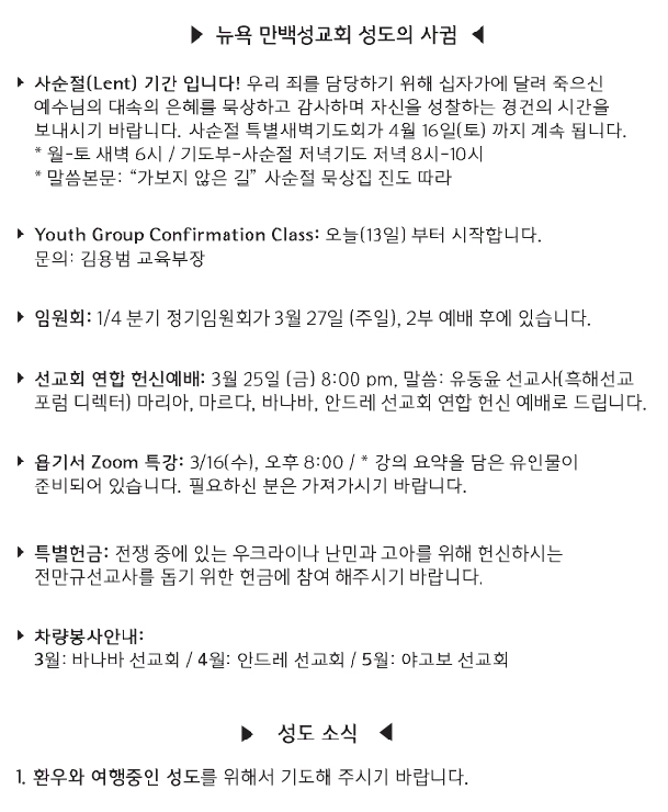 [교회소식] 2022년 3월 13일 뉴욕 만백성교회 성도의 사귐