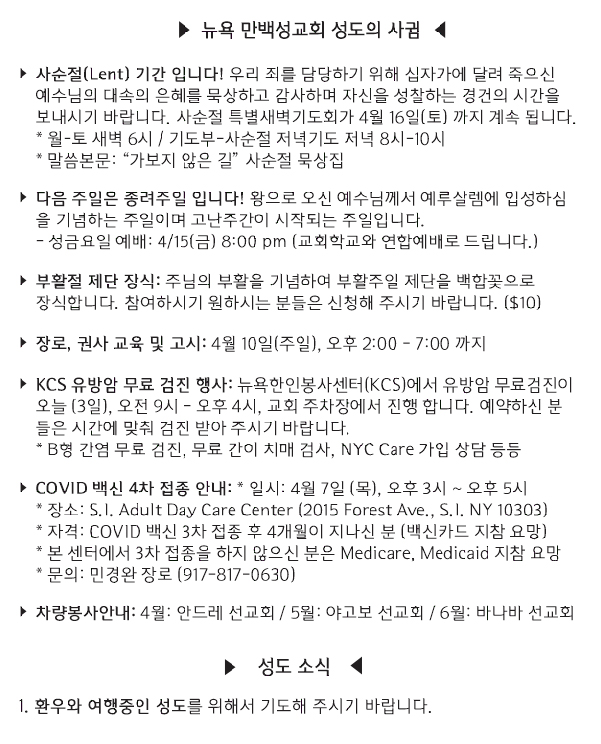 [교회소식] 2022년 4월 3일 뉴욕 만백성교회 성도의 사귐