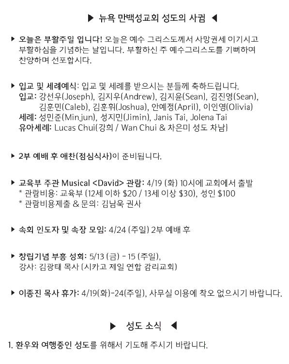 [교회소식] 2022년 4월 17일 뉴욕 만백성교회 성도의 사귐