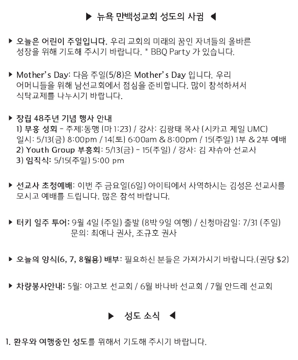 [교회소식] 2022년 5월 1일 뉴욕 만백성교회 성도의 사귐