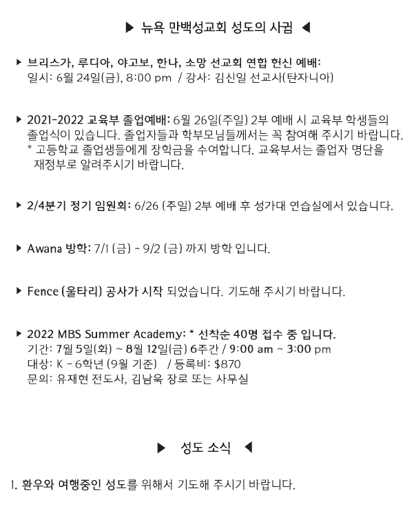 [교회소식] 2022년 6월 12일 뉴욕 만백성교회 성도의 사귐