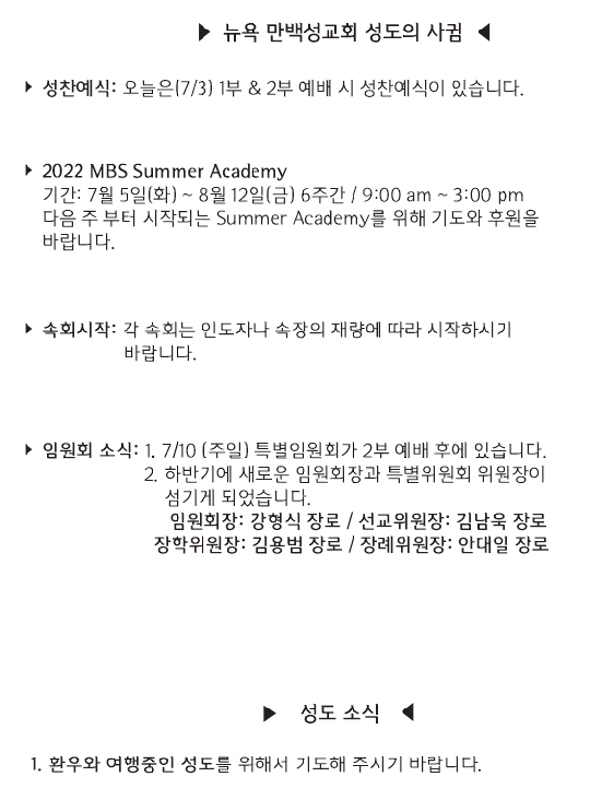 [교회소식] 2022년 7월 3일 뉴욕 만백성교회 성도의 사귐