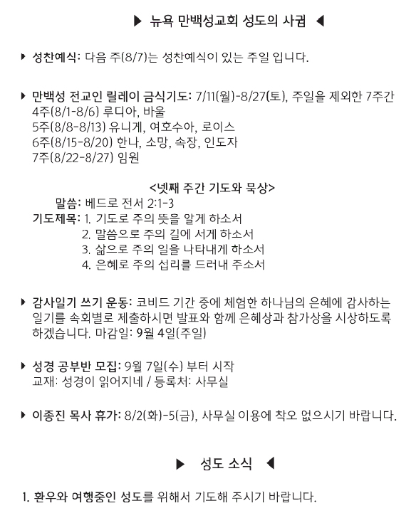[교회소식] 2022년 7월 31일 뉴욕 만백성교회 성도의 사귐