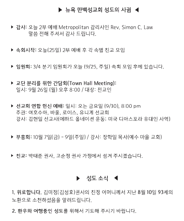 [교회소식] 2022년 9월 25일 뉴욕 만백성교회 성도의 사귐