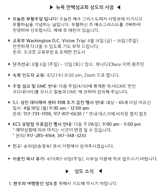 [교회소식] 2023년 4월 9일 뉴욕 만백성교회 성도의 사귐
