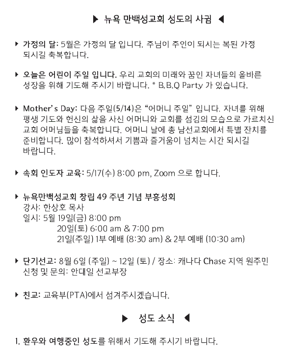 [교회소식] 2023년 5월 7일 뉴욕 만백성교회 성도의 사귐
