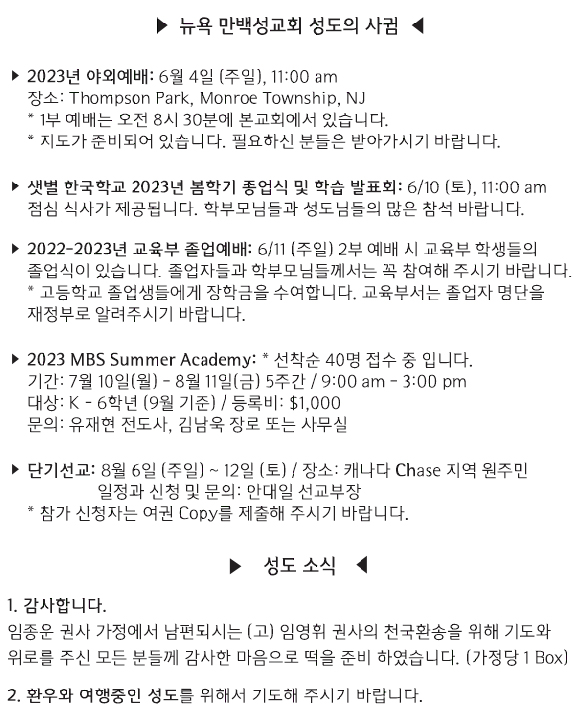 [교회소식] 2023년 5월 28일 뉴욕 만백성교회 성도의 사귐