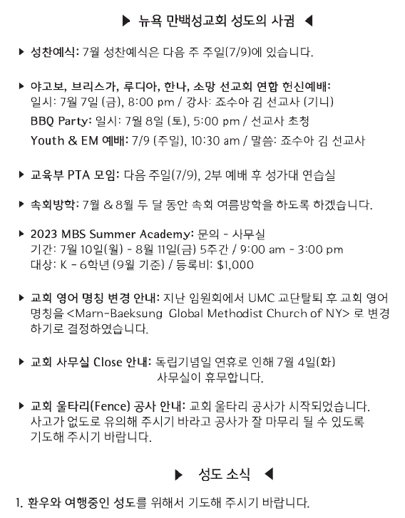 [교회소식] 2023년 7월 2일 뉴욕 만백성교회 성도의 사귐