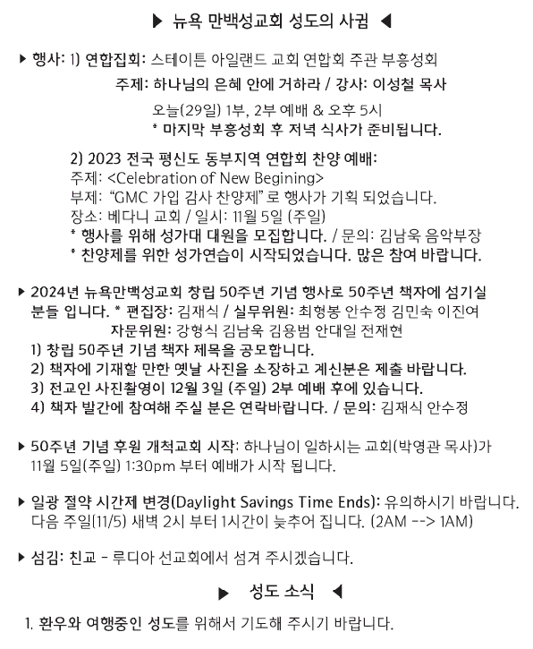 [교회소식] 2023년 10월 29일 뉴욕 만백성교회 성도의 사귐