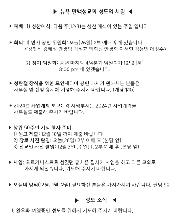 [교회소식] 2023년 11월 26일 뉴욕 만백성교회 성도의 사귐