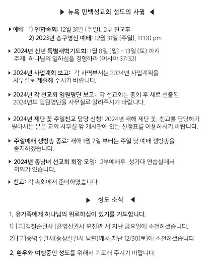 [교회소식] 2023년 12월 31일 뉴욕 만백성교회 성도의 사귐