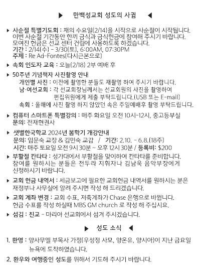 [교회소식] 2024년 2월 18일 뉴욕 만백성교회 성도의 사귐