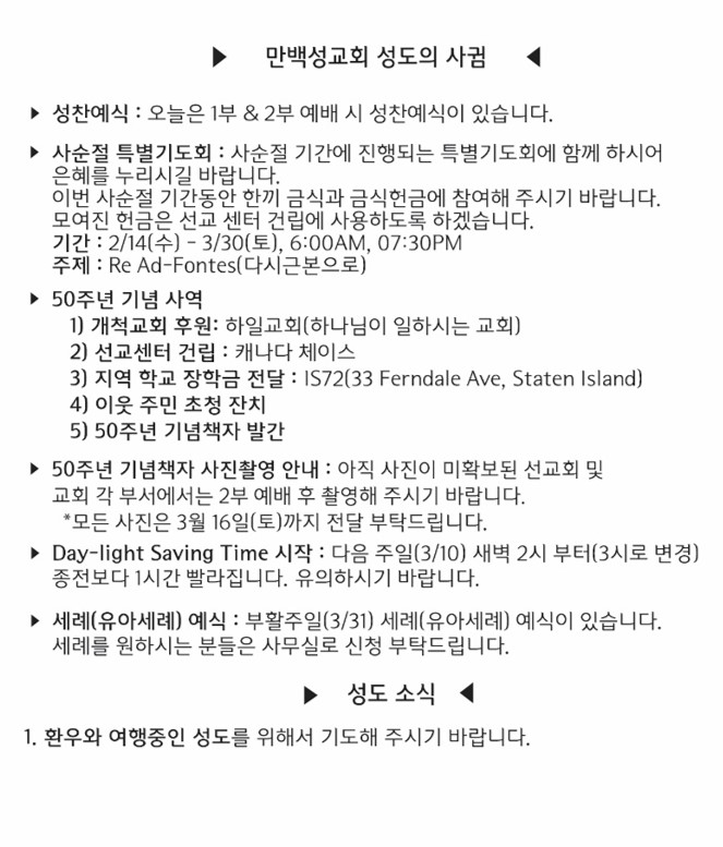 [교회소식] 2024년 3월 3일 뉴욕 만백성교회 성도의 사귐