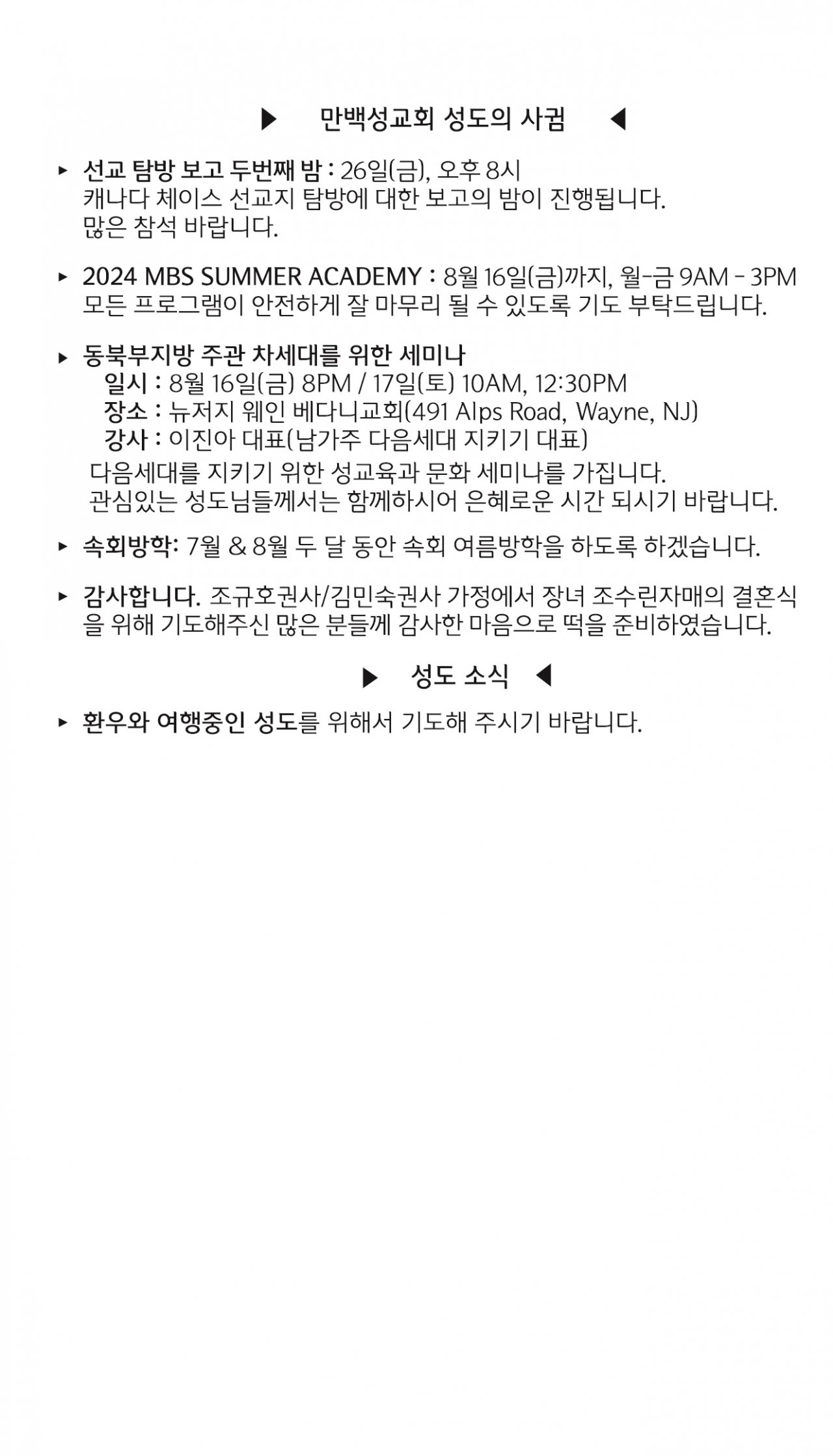 [교회소식] 2024년 7월 21일 뉴욕 만백성교회 성도의 사귐