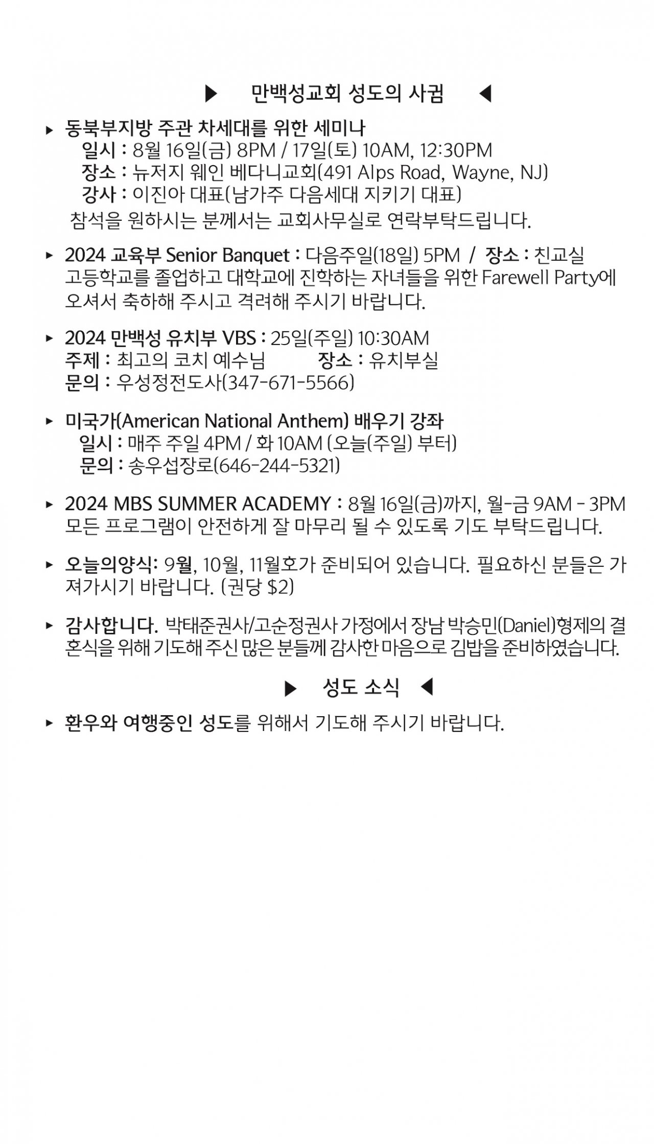 [교회소식] 2024년 8월 11일 뉴욕 만백성교회 성도의 사귐