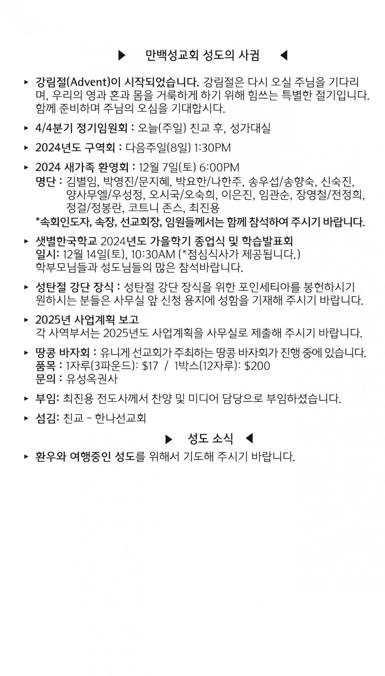 [교회소식] 2024년 12월 1일 뉴욕 만백성교회 성도의 사귐