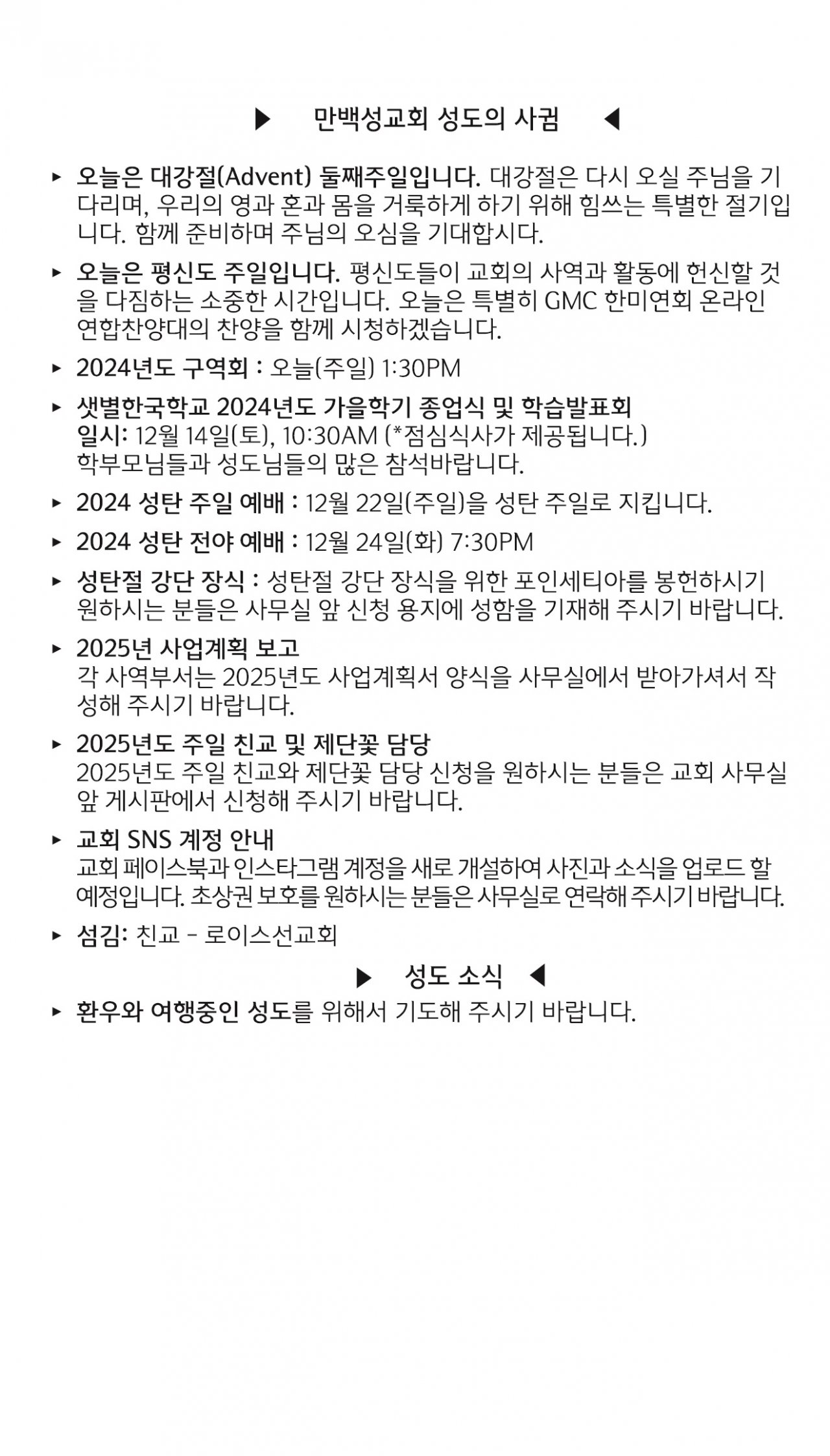 [교회소식] 2024년 12월 8일 뉴욕 만백성교회 성도의 사귐