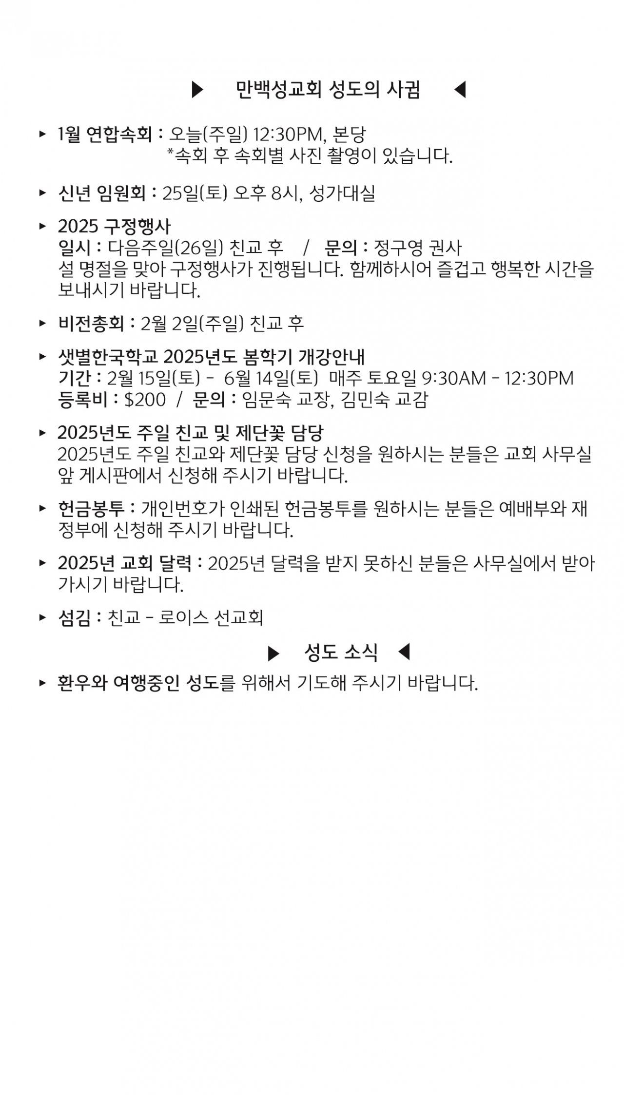 [교회소식] 2025년 1월 19일 뉴욕 만백성교회 성도의 사귐