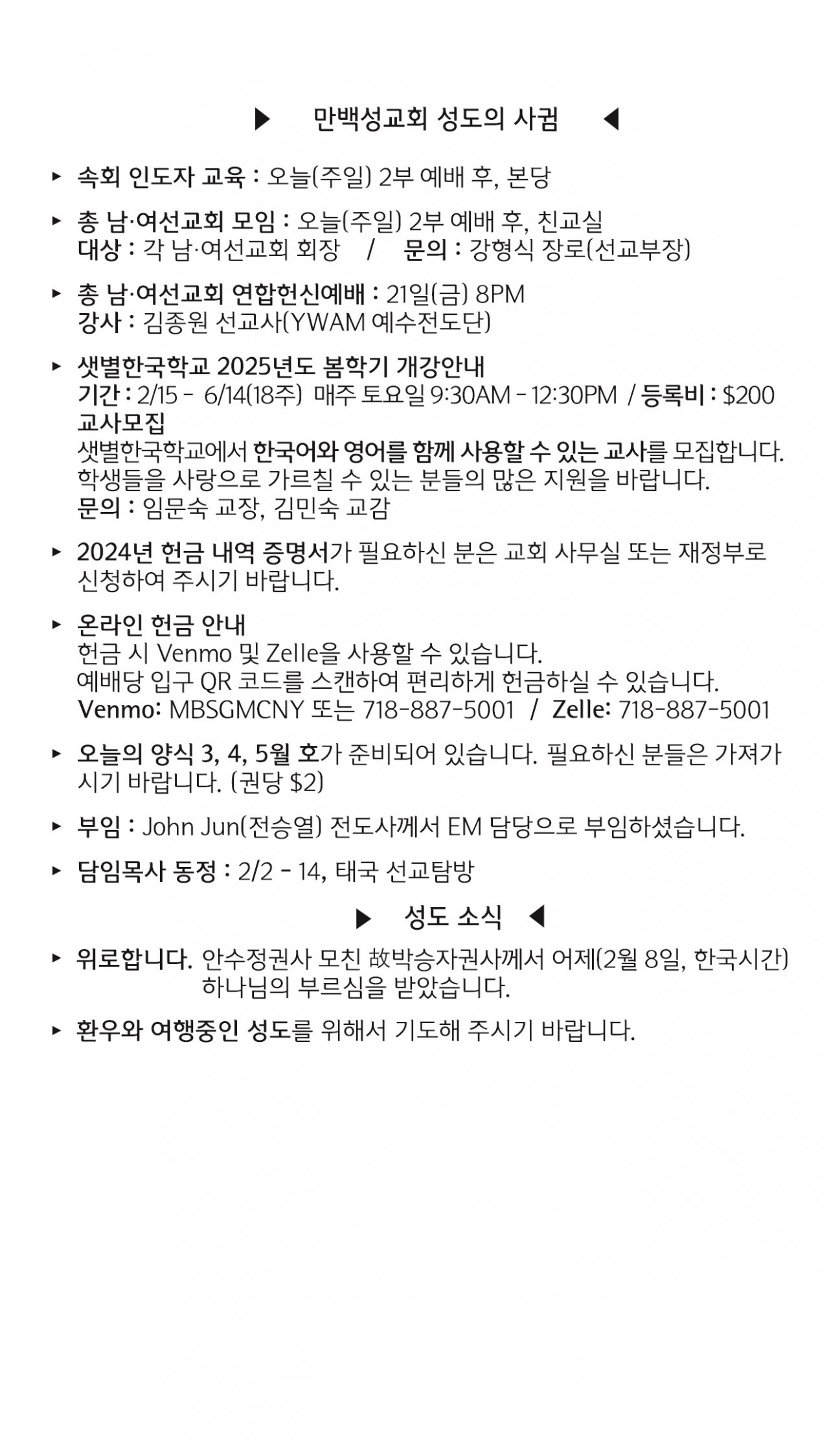 [교회소식] 2025년 2월 9일 뉴욕 만백성교회 성도의 사귐