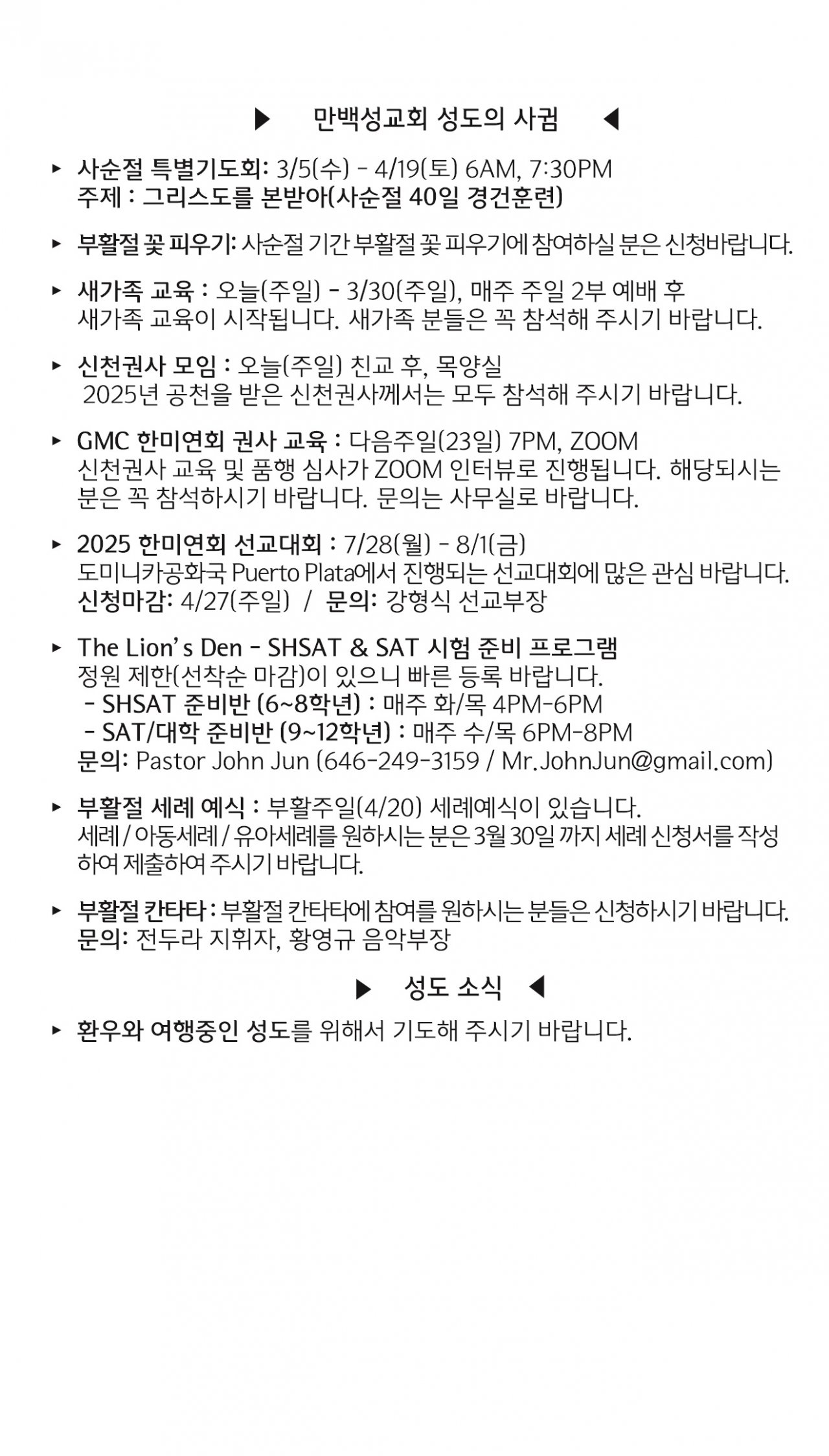 [교회소식] 2025년 3월 16일 뉴욕 만백성교회 성도의 사귐
