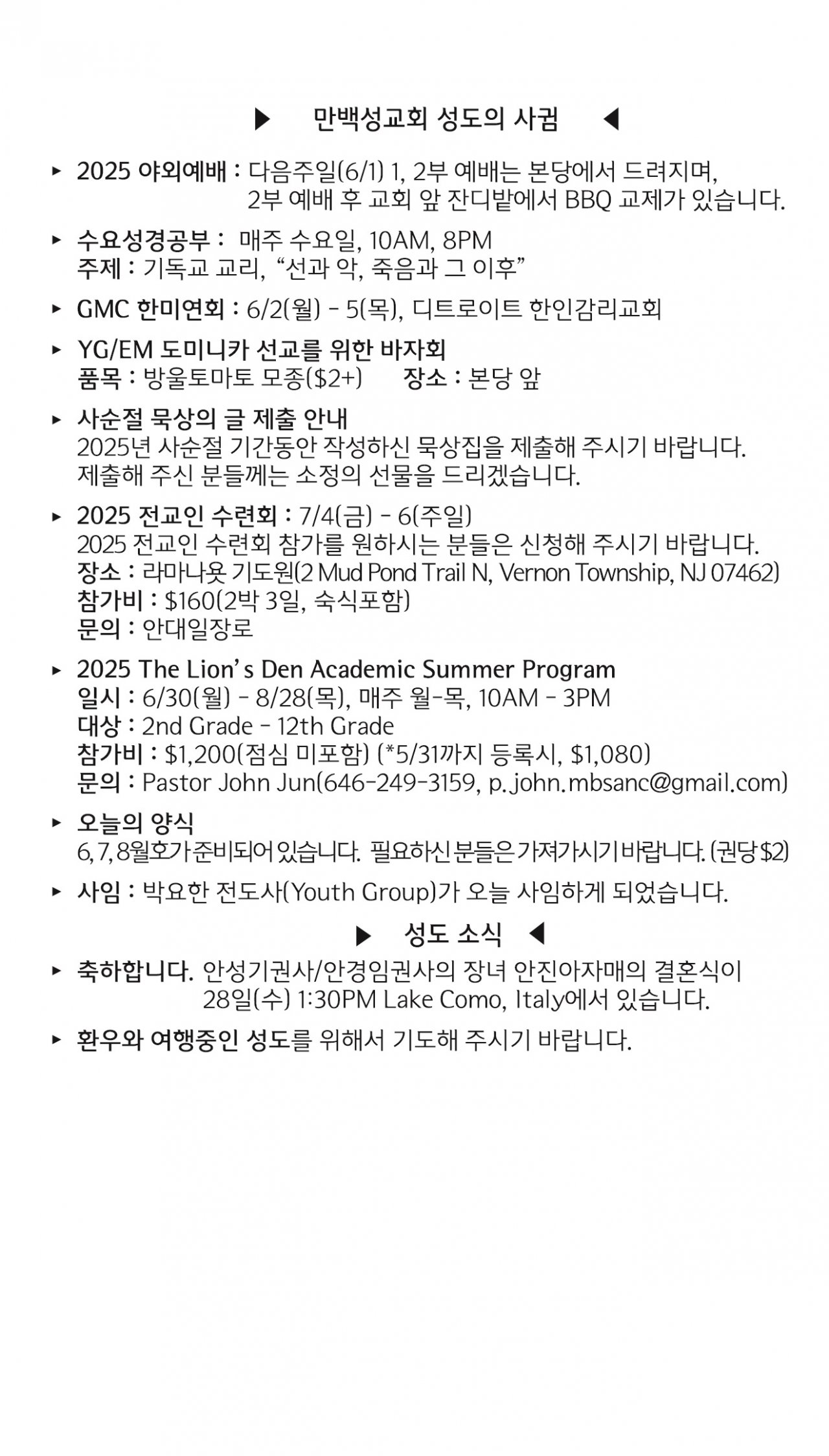 [교회소식] 2025년 5월 25일 뉴욕 만백성교회 성도의 사귐