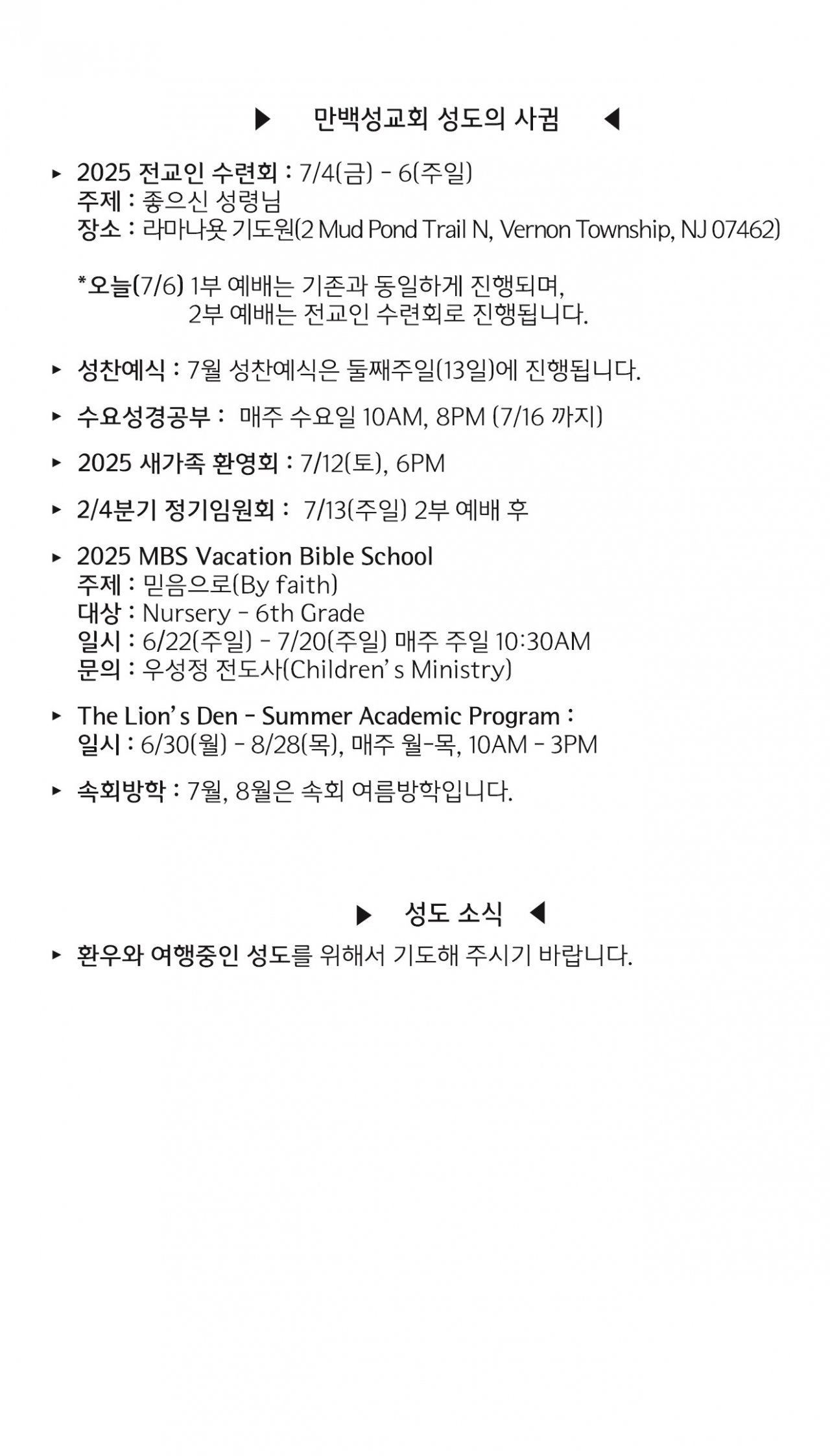 [교회소식] 2025년 7월 6일 뉴욕 만백성교회 성도의 사귐