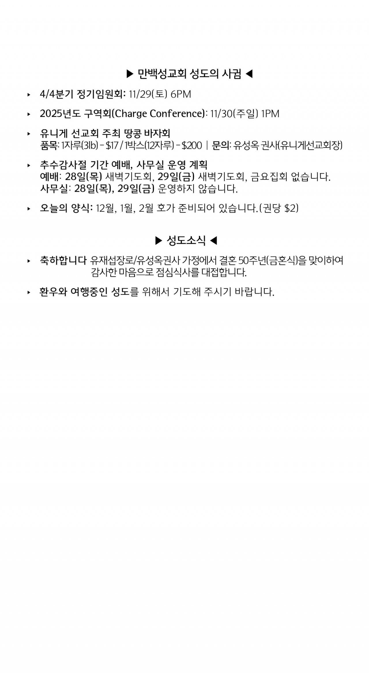 [교회소식] 2025년 11월 23일 뉴욕 만백성교회 성도의 사귐