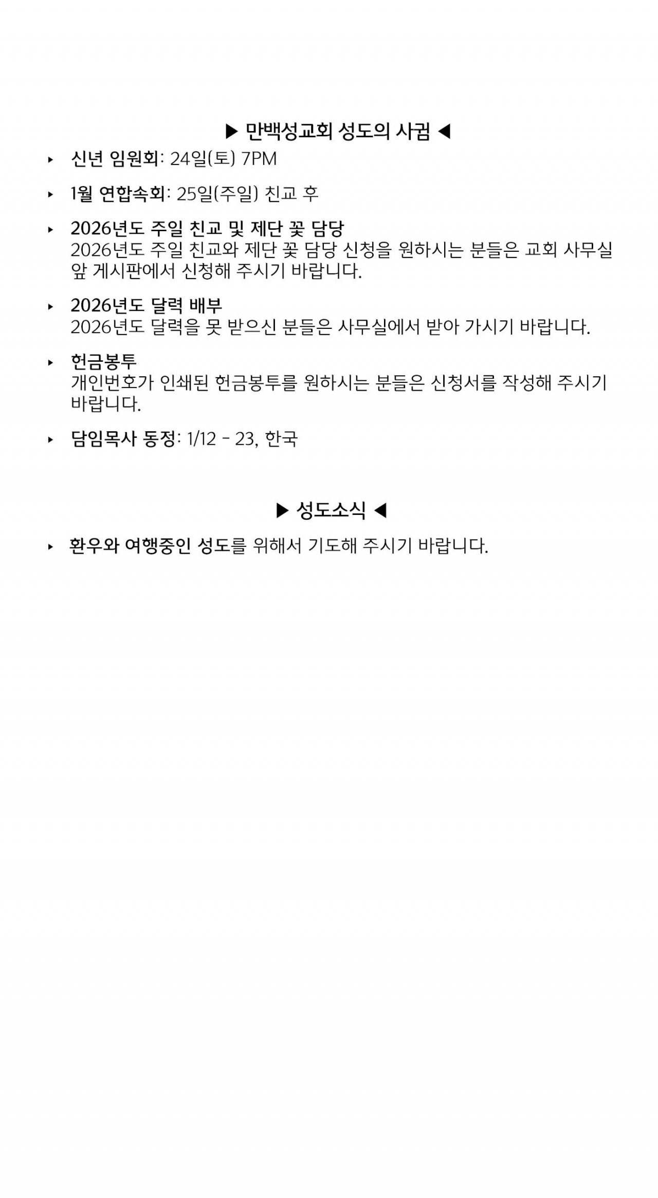 [교회소식] 2026년 1월 11일 뉴욕 만백성교회 성도의 사귐