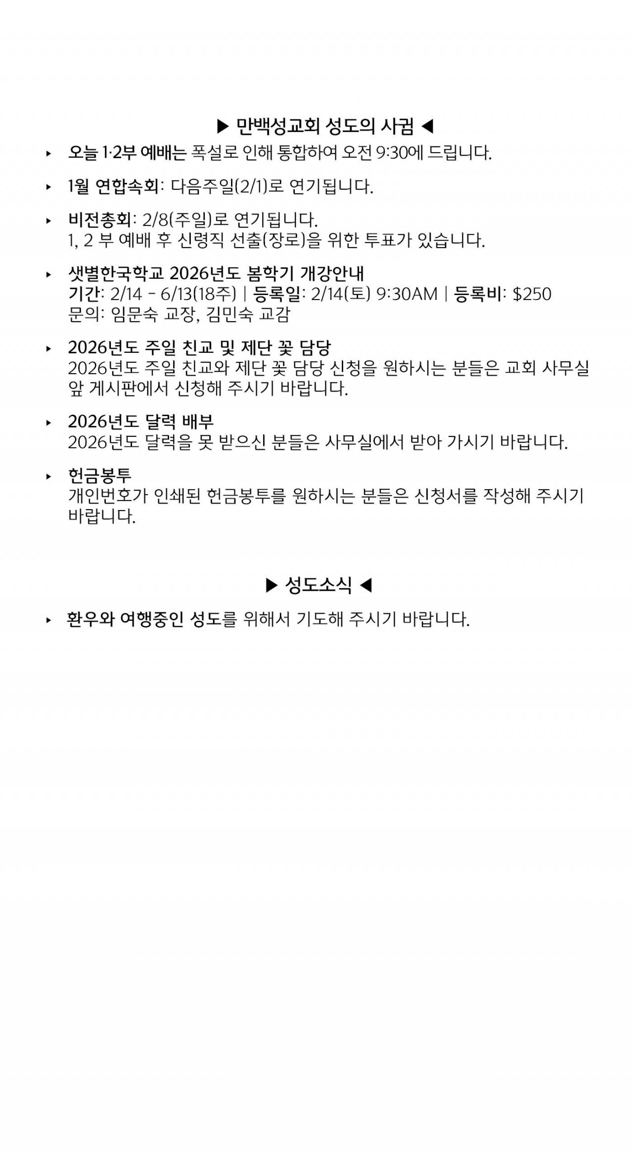 [교회소식] 2026년 1월 25일 뉴욕 만백성교회 성도의 사귐