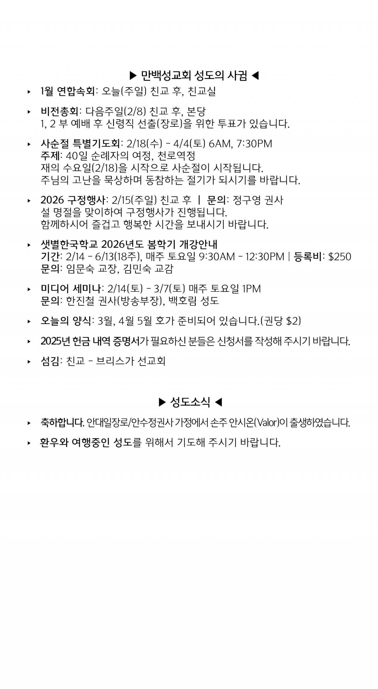 [교회소식] 2026년 2월 1일 뉴욕 만백성교회 성도의 사귐