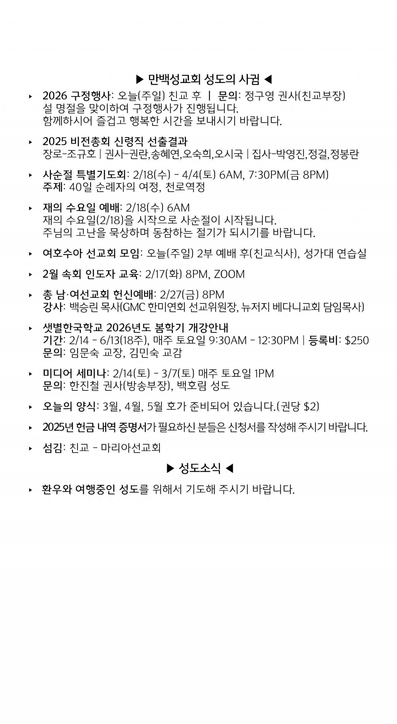 [교회소식] 2026년 2월 15일 뉴욕 만백성교회 성도의 사귐