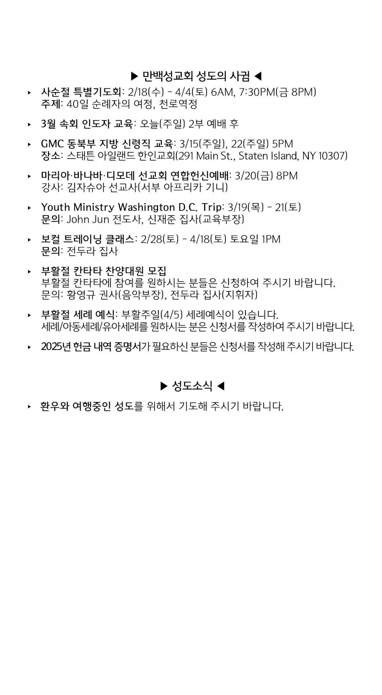 [교회소식] 2026년 3월 8일 뉴욕 만백성교회 성도의 사귐