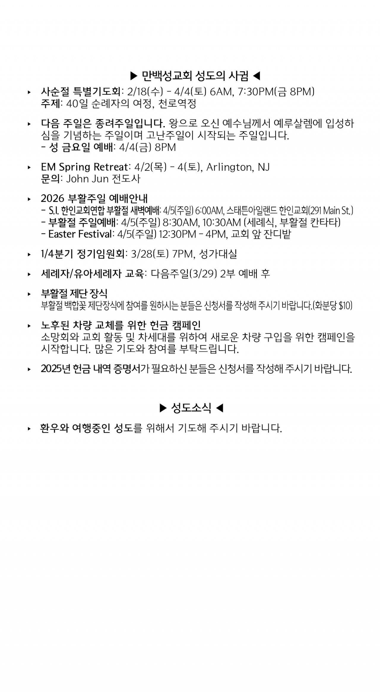 [교회소식] 2026년 3월 22일 뉴욕 만백성교회 성도의 사귐