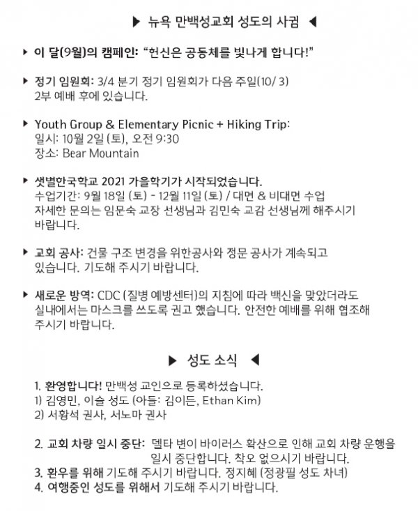 [교회소식] 2021년 9월 26일 뉴욕 만백성교회 성도의 사귐