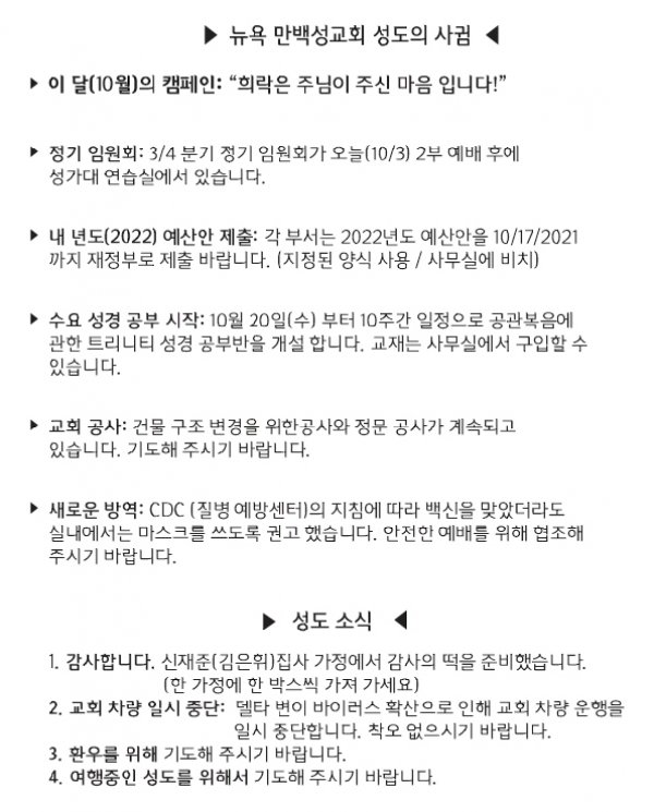 [교회소식] 2021년 10월 3일 뉴욕 만백성교회 성도의 사귐
