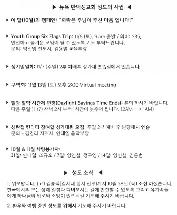 [교회소식] 2021년 10월 31일 뉴욕 만백성교회 성도의 사귐