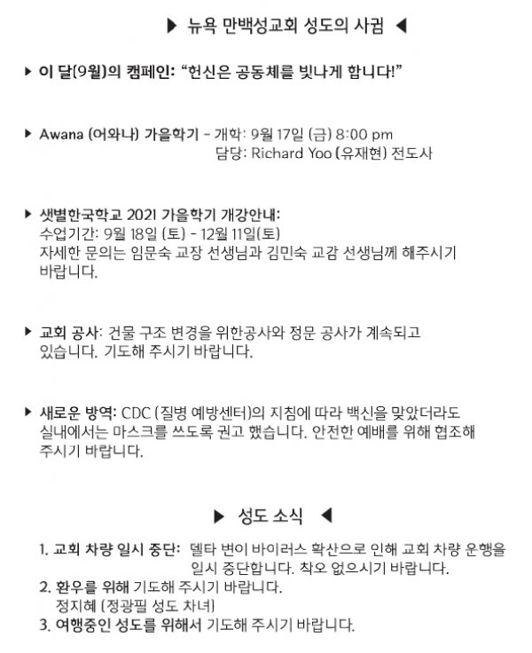 [교회소식] 2021년 9월 12일 뉴욕만백성교회 성도의 사귐