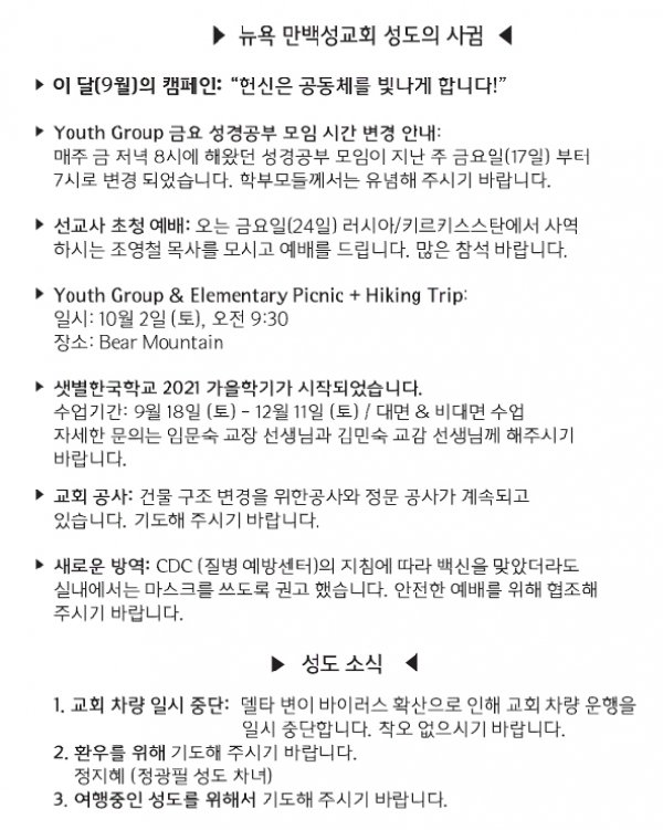 [교회소식] 2021년 9월 19일 뉴욕 만백성교회 성도의 사귐
