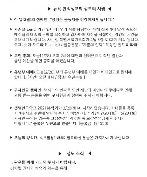[교회소식] 2021년 2월 28일 뉴욕만백성교회 성도의 사귐