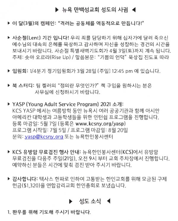 [교회소식] 2021년 3월 14일 뉴욕만백성교회 성도의 사귐